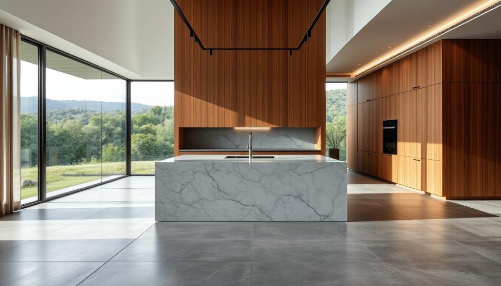 A modern, minimalist interior with a focus on high-quality materials. Sleek, gray concrete floor tiles stretch across the foreground, complemented by a central island crafted from gleaming, veined marble. Warm-toned wood paneling lines the walls, accentuated by strategically placed track lighting that casts a soft, diffused glow. Large windows in the background offer a panoramic view of a lush, verdant landscape, blending the indoors and outdoors seamlessly. The overall atmosphere is one of understated elegance, where form and function harmonize to create a timeless, sophisticated space.