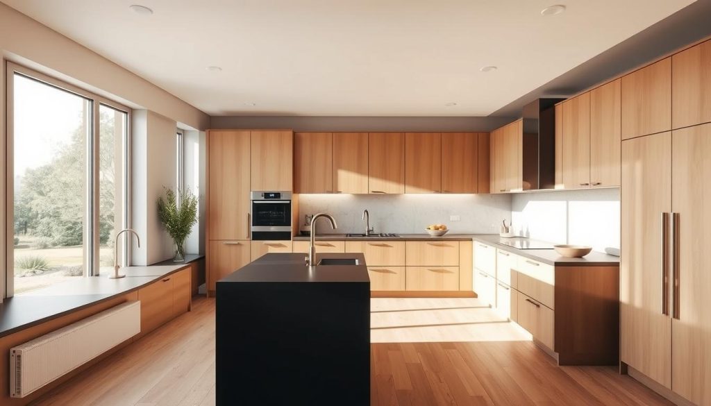A modern, minimalist kitchen with sleek, handleless cabinets in a warm, neutral palette. The layout features a large, central island with a matte black countertop, complemented by brushed metal fixtures and appliances. Abundant natural light streams in through large windows, casting a soft, diffused glow throughout the space. The flooring is a light-toned hardwood, adding warmth and texture. The overall design exudes a sense of sophisticated simplicity, blending form and function seamlessly.