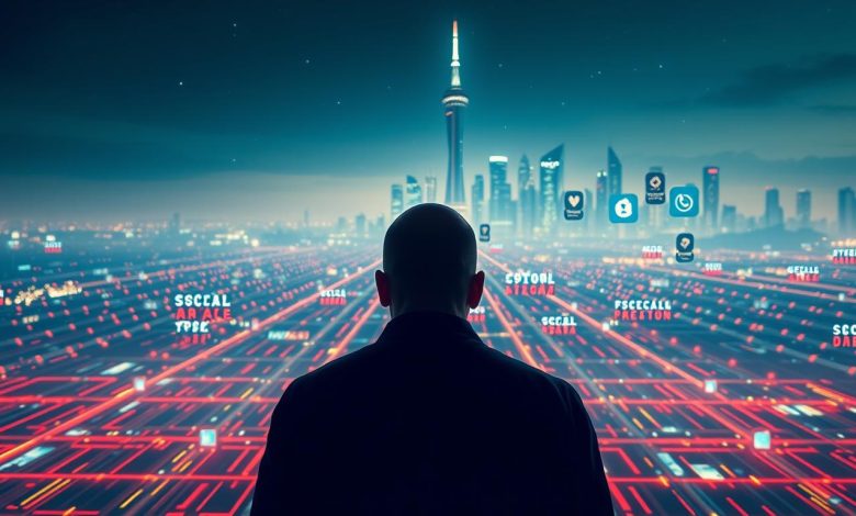 A cyberpunk-inspired cityscape at night, with a towering skyscraper at the center, its windows casting a neon glow. In the foreground, a silhouetted figure in a hooded jacket stands, their hands raised to a futuristic tablet device. Intricate digital patterns and glitching effects emanate from the tablet, casting an eerie, ethereal light across the scene. In the background, a swirling vortex of data streams and binary code, hinting at the complex web of social media networks and the vulnerability they pose. The overall atmosphere is one of technological unease and the threat of digital exploitation. Branding: “https://bestuptoeveryday.com/”